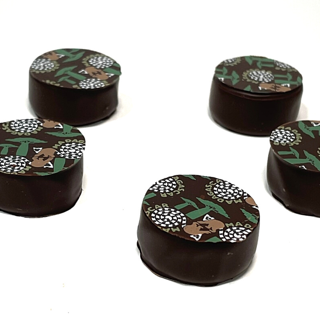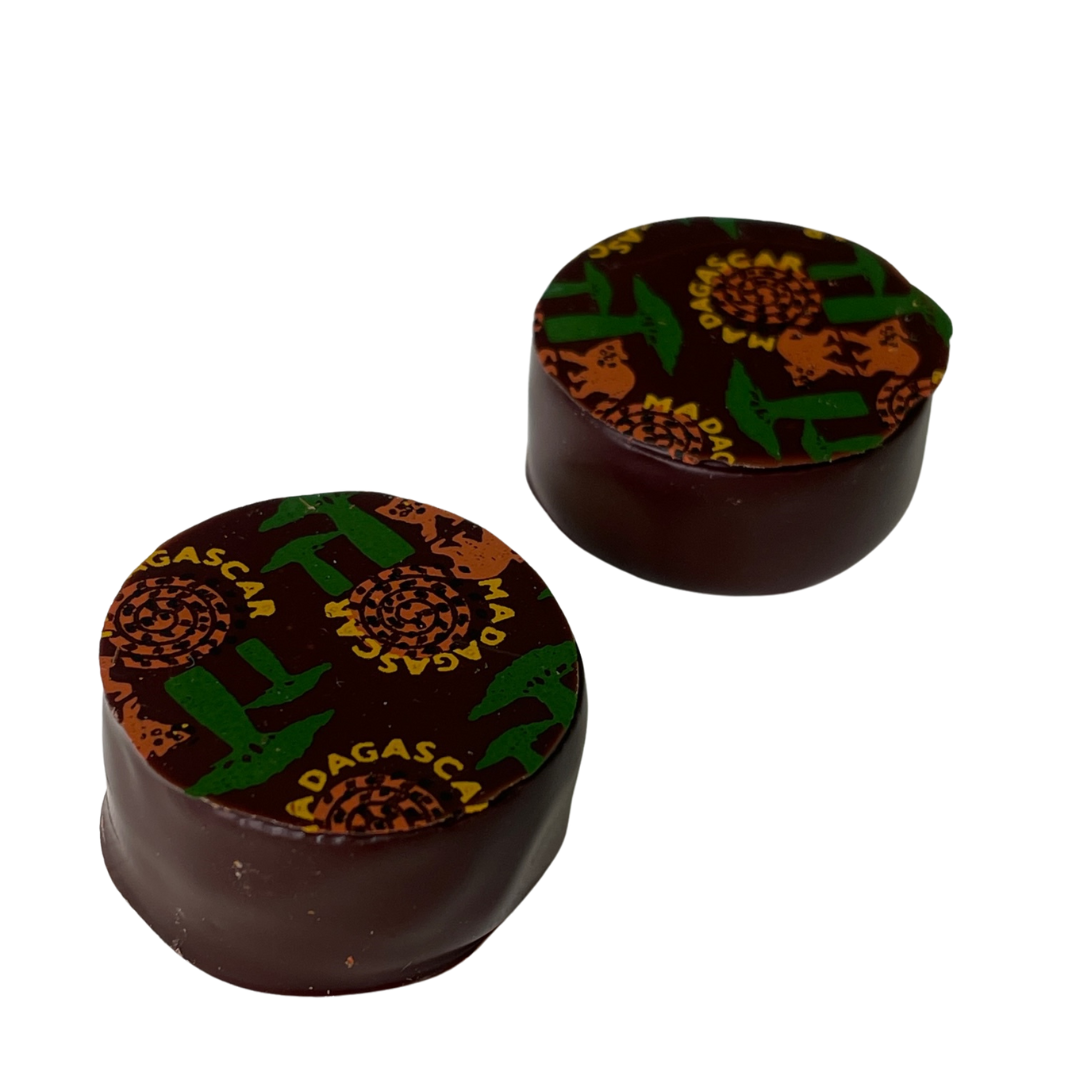 Este bombón Grand Cru Madagascar trufado de cobertura negra «bean to bar» del 70%. Grand Cruz Madagascar bañado con cobertura negra. Muy afrutado, con notas florales y ácidas, poco amargo y poco tostado.