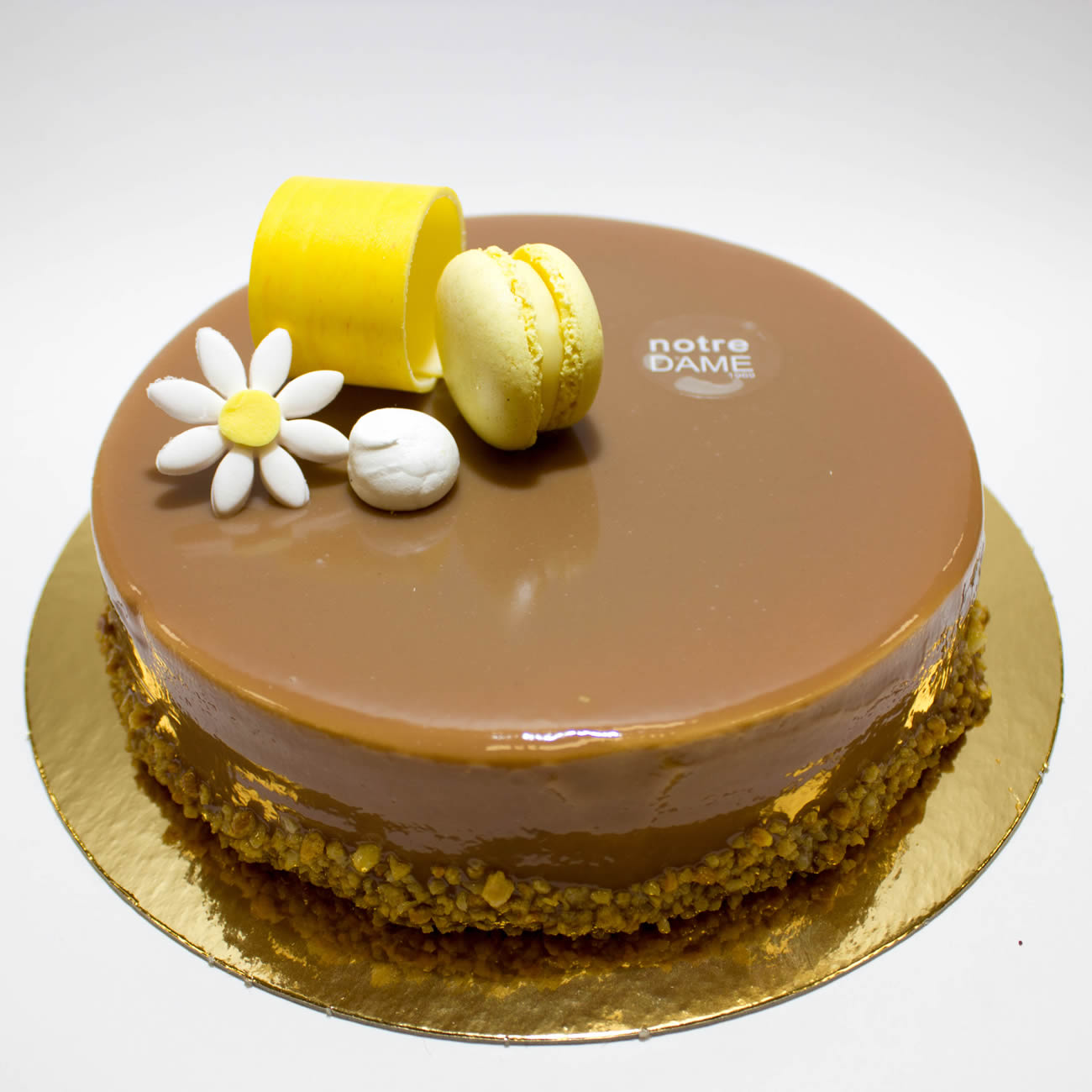 Capas intercaladas de sabroso bizcocho de chocolate y cremoso mouse de chocolate al caramelo. Destaca su perfecto equilibrio entre chocolate y caramelo. Toda bañada de una brillante cubierta de chocolate con leche.